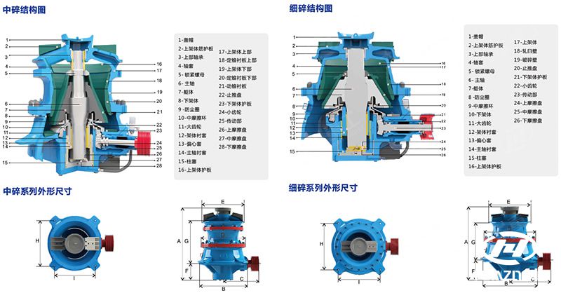 该系列圆锥有中碎和细碎两种机型,每种机型有多种腔型可供选择,还可通过调整偏心距来适应不同的生产工艺。通过调整传动轴转速,还可实现对产品级配的调整,从而使设备的价值充分体现。