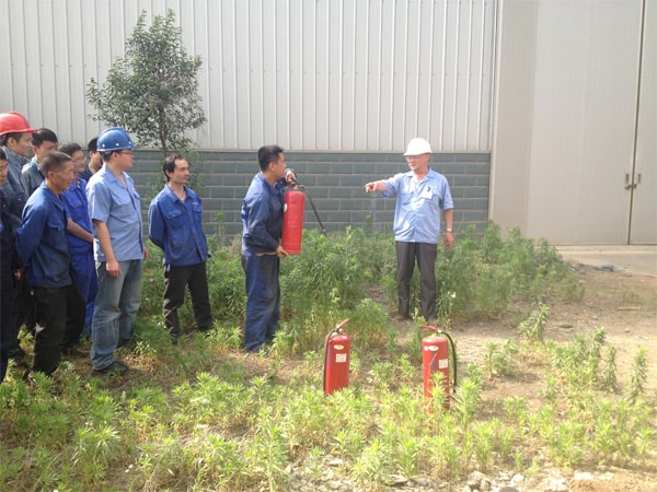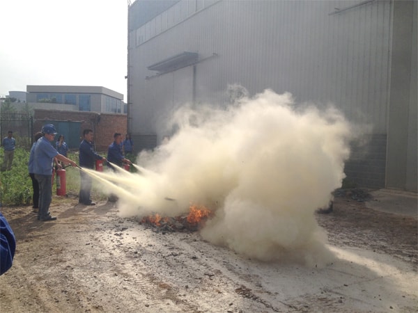 参加演习人员有各部门、各车间新入职员工和各车间班组长及安全员,机加车间主任张自力,金构车间主任邓兴军、曹永禄,液电车间主任王海涛、张孟喜,制造部长张彦宝等领导都带头参加灭火演习。在灭火演练前,公司安全员吴建国首先把怎样使用灭火器材和灭火注意事项进行讲解:一是在日常消防工作中一定要把预防火灾放在首位,积极贯彻落实各项防火措施,防患与未然,最大限度减少火灾;二是一旦发生火灾要及时有效予以扑灭创造条件,减少火灾危害和最大限度减少火灾所造成的人身伤亡和财产损失;三是正确使用灭火器材,扑灭火灾时,把灭火器上下颠倒几次,离火点3-4米时,拔出保险销,一手握喷嘴,一手将压把压下,干粉向火的根部喷出,灭火要彻底迅速,不要遗留残火,以防复燃。