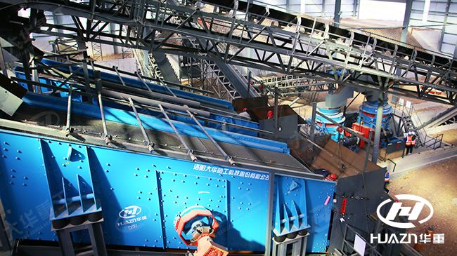 重机——400t/h河卵石生产线,整条生产线分别为给料单元、粗碎单元、中碎单元、细碎单元、筛分单元、洗砂单元、污水处理单元。由于砂石原料大小不一,进料口采用两级给料方式,不会产生弃料,提高了产品的经济效益。生产工艺中设计有临时缓冲料堆仓和制砂调节仓各一个,可以分别处理天然砂和机制砂石,分别开机运行,独立运行。