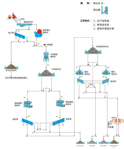 由于矿山剥离废石粒度大,粗碎必须满足最大进料700mm的原料,因此,在为其设计配套的方案采用ZSW490 ×110振动喂料机、DHKS4236颚式破碎机、PFQ1315强力反击破碎机、4YK2460振动筛等主要设备,每小时可将250吨700mm以下的矿山剥离 废石加工为0~5mm、5~10mm、10~20mm、20~30mm的四种砂石料,符合高速公路建设用砂石规格标准。采用喷雾除尘代替袋式除尘器, 不仅投资少,运行费用低,而且除尘效果好,产品重量零耗损。