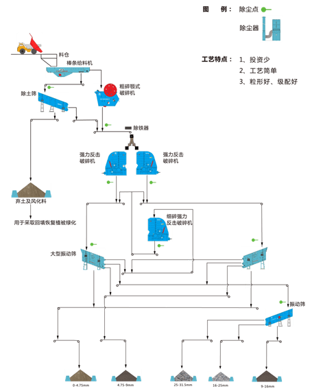对于矿山废石二氧化硅含量低于10%的原料加工,可采用强力反击破为主的生产线加工水泥矿山废石(见下 工艺图),该工艺具有投资少、工艺简单,产品粒形、级配好等特点。
