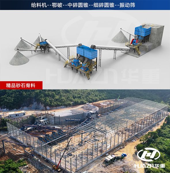 2、硬性物料:给料机+颚式破碎机+圆锥破碎机+制砂机+洗砂机+振动筛+输送带