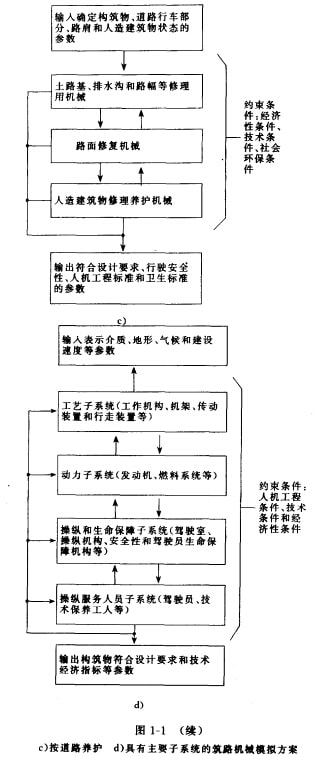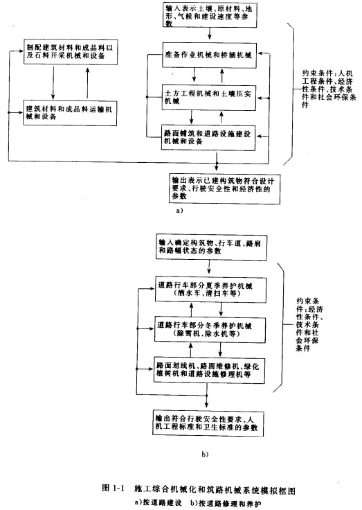 筑路机械由许多主要子系统组成(图1-1d):工艺于系统(工作机构和行走装置);动力子系统(发动机);操纵和生命保障于系统以及操作人员子系统。筑路机械主要特殊的标志是具有可以周期作业和连续作业的专用工作机构。为了布置工作机构,筑路机械应具有原结构的机架。为此,广泛应用载重汽车和拖拉机的标准底盘或轮式牵引车。路面铺筑作用的综合机械化和自动化是基丁多种通用建筑机器和专用筑路机械合理的组合。