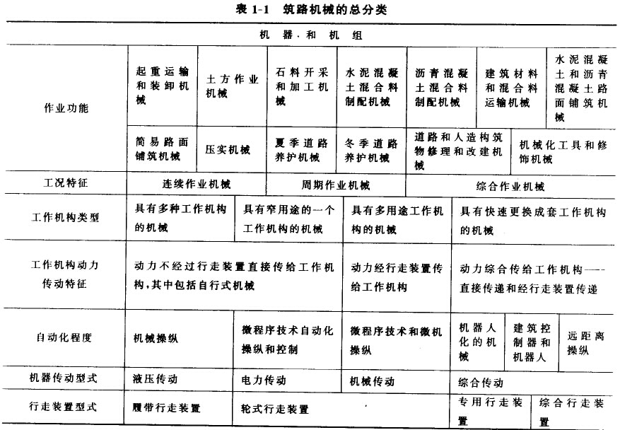 筑路机械根据机器和工作机构作业和结构特征的总分类列于表1-1。