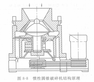 如图8-8为惯性圆锥破碎机的结构图,工作机构由定锥和动锥 组成,动锥轴插入轴套中,电动机的旋转运动通过传动机构传给固定在轴套上的激振器,激振器旋转产生惯性力,使动锥绕球面支撑的球心做旋摆运动,从而使破碎腔的物料产斗强烈脉动冲击。从而对物料进行破碎。
