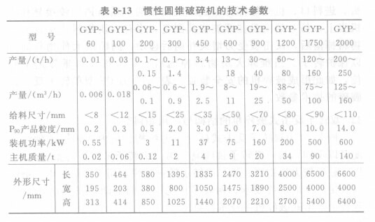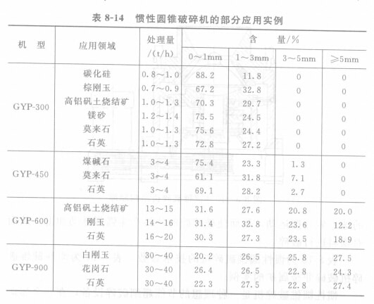 表8-13为惯性圆锥破碎机的技术参数,表8-14为惯性圆锥破碎机破碎非金属矿的实例。