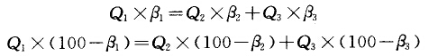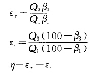 式中:η为筛分效率,%;Q1、Q2、Q3为入筛、筛上、筛厂固体废物重量,Q1= Q2十Q3;β1、β2、β3为入筛、筛上、筛下固体废物中小于筛孔的细粒累积含量,%; εx、εc为细粒采收率、粗粒采收率。