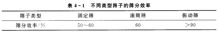 筛于运动方式对筛分效率有较大的影响,同一种团体废物采用不同类型的 筛子进行筛分时,其筛分效率大致如表4—1所示。