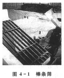 棒条筛(GrizZly screen)由一组具有一定断面形状的棒条所组成。如图4—1所示,这些捧条平行安放,棒条与棒条之间的间隙即筛孔尺寸。棒条筛安装倾角应大于废物对筛面的摩擦角,一般为30°一35°,以保证废物沿筛面下滑。棒条筛筛面的筛孔尺寸为要求筛下产品粒度的1.1—1.2倍,一般筛孔尺寸不小于50 mm。物料从棒条一端给入,并顺棒条方向运动,细粒穿过缝隙成为筛下物,粗粒从端面的末端排出。