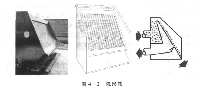 弧形筛(图4—2)筛面呈弧形,待筛分物料制成料浆。料浆含水约为30%。 从弧形筛顶部结入。在筛面上,由于料浆受重力、离心力及筛条对料浆的阻力作 用,使料浆紧贴筛面流动。紧贴筛面的下层料浆运动速度低,细粒和液体从筛缝 中落入筛下,大颗粒从筛面末端排出。一般通过筛缝的颗粒尺寸为筛缝宽度的 1/4,所以这种筛不易发生堵塞,但筛分效率低。