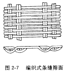 条缝筛面的结构型式有穿条式(图2—5),焊接式(图2-6)和编织式(图2—7)三种。