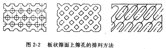 2.板状筛面:板状筛面通常由5—8mm厚的钢板制成。板状筛面上的筛孔形状和排列方法如图2—2所示。板状筛面的优点是比较牢固,刚度较大。使用寿命校长。其缺点是质量大,开孔率较小(筛孔净面积与筛而总面积之比),约为40一60%,板状筛面一般用于中等粒级物料的筛分。筛孔尺寸通常为10一50mm。