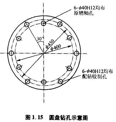 c)对破碎机转子部的端部圆盘和中间圆盘进行改进,提高锤头的利用率,相对延长远头的使用寿命。以PC800mm x 800mm型锤式破碎机为例,可在端部圆盘和中间圆盘上配钻6个φ40mm销轴蚀孔,均布在φ450mm的圆周上,与原销轴孔错开30°圆心角布置,见图1.15。把经过正反两次交替使用后不能在原来位置上继续工作的空套锤头、销轴及间隙竟拆下,与新配站的6个φ40mm轴孔组装起来,以保证转子平衡。重新调整锤头与筛条、破碎板和筛条与筛条之间的间隙后继续使用此时锤头顶点位置在φ820mm圆周上,锤头线速度略高,打击力略降,但可通过调整进机物料粒度加以解决。即:将入料粒度由≤120mm调至≤100mm就可以正常工作。据介绍,改进后锤头可正反交替使用4次,睡头寿命延长13d,年锤头耗用量节约2/5。最后卸下的“锤头”,用合金钢焊条堆焊或整形处理后可继续使用。
