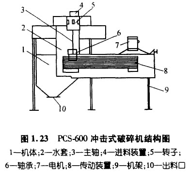 冲击式破碎机的结构如图1.23所示。电机通过三角皮带驱动装宜和转子高速旋转。从进料装置进入的物料,通过转子上部的给料管进入转子,被分配锥均匀地分布在转子的各个通道中,物料在通道内被加速,在极短时间内达到使物料足以破碎的速度,高速抛出的物料与机体内的衬板碰撞,形成第一破碎,随后第一次破碎的物料又受到继续抛出的物料的碰撞,形成物料与物料之间的多次碰撞,从而达到破碎物料的目的。