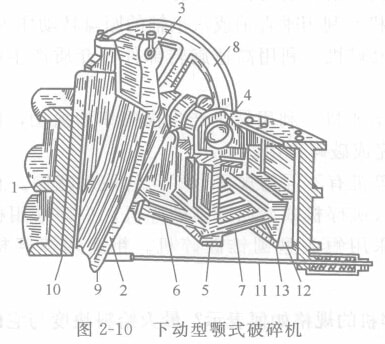 它是由下列主要部件构成:固定颚板又是机架的前壁1,悬挂在轴3上的可动颚板2,偏心软4,垂直连杆5,肘板6及7,传动飞轮8,两颚板上的衬板9、10,带有弹簧的拉杆11,肘板座12,调节块13。