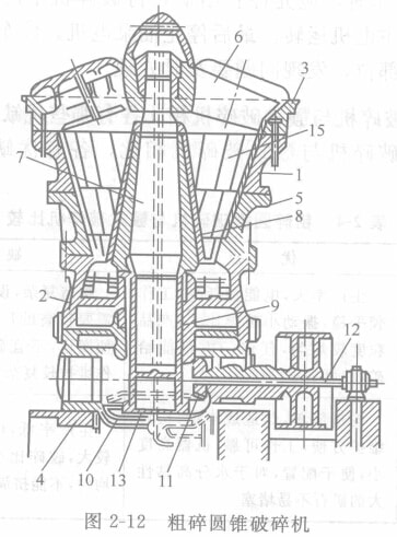 粗碎圆锥破碎机(旋回破碎机)的剖面图如图2—12所示。