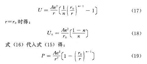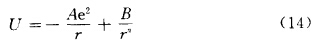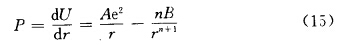 式(14)中的第一项由引力造成,e为质点所带电荷电量;r为质点间距离;A为麦德隆常数;第二项由斥力造成,B是和结晶构造有关的常数;指数和晶体类型有关,离子型晶体n=9~11,分子型晶体n=2~3。