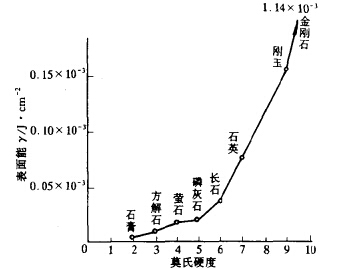 晶体在破碎之前到破碎之后,所接受的是一定的能量△U,所产生的效果是增加了若干新的表面积△S。由于居于物体表面的晶胞所具有的结合能多于中心部分的晶胞,因此晶体的表面具有表面能。表面能越大,晶体就越坚固。图4给出了几种标准矿物的表面能数值,金刚石在〔111〕方向的表面能是0. 114X10-2J/cm2。