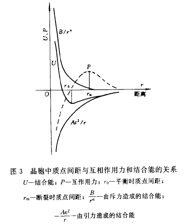 图3中的曲线U表示结合能和质点距离的关系。在吸引力和斥力相等的位置(r=r0),结合能数值最小,这就是平衡位置。增大或减小质点的距离,都将导致结合能增大,这就需要外力对它做功。质点间的互作用力P等于结合能对距离的微分: