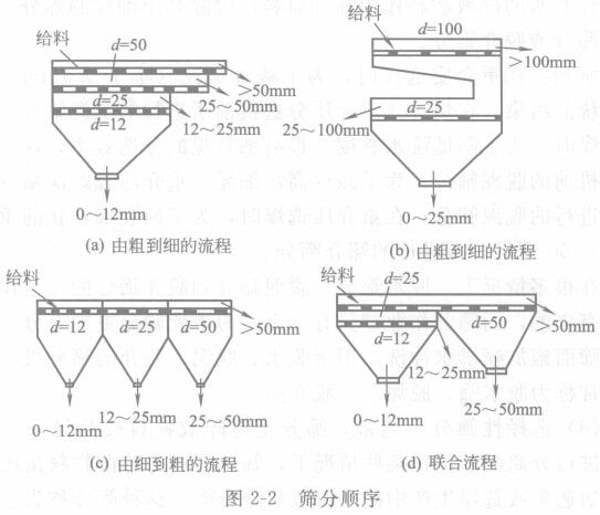(3)联合法:混合筛分。在联合流程中,一部分筛面由粗到细排列,另一部分筛面由细到粗排列,如图2—2(d)中,在生产实践中,通常使用由粗到细或联合的筛分流程。