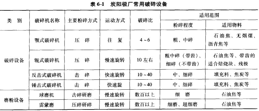 在破碎过程中,破碎机进口物料粒度与出口物料粒度之比称为粉碎比或破碎比。破碎比大小与粉碎设备特性、物科特性以及工艺要求和产量有关。破碎比过大,会使物料过分研磨或破碎,使小粒度增加,粒度分布不合理,产量下降i破砷比过小,也会使破碎的物料粒度不合要求,并增加破碎次数。炭阳极厂常用的破碎设备及特性见表6—1。