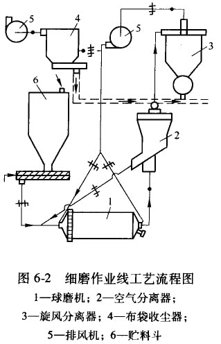 闭路循环细磨作业线中(图6—2),除球磨机外,还包括:粗粒分离用的字气分离器、旋风分离器(大部分粉料在其中沉降并从中排出)、对气流进行最后除尘用的布裳收尘器以及排风机。