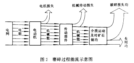 如图2所示,磨矿过程中有三次大的能量损失。第一次能量损失是电动机将电能转变为机械能时产生的。该损失的大小取决于电动机的效率,按目前电动机的制造水平,效率一般为90%-95%,电动机损失约占总能耗的5%-10%,这部分损失较小,也难于降低,此环节上节能潜力不大。第二次能量损失是从电动机输出的机械能经传动系统而转变为磨矿介质的机械能时产生的。该损失大小取决于传动效率高低。按目前的机械制造水平,这部分损失通常占总能耗的10%-15%。多年来曾搞过以滚柱轴承代替滑动轴承、采用液力静压轴承和采用环形马达直接传动等办法,但此部分能量损失比例不大,节能的效果有限,节能潜力也不大。第三次能量损失是介质的机械能转变为矿石的表面能时