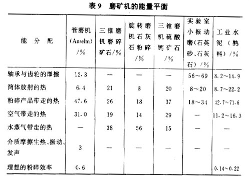 产生的。经前面两次能量损失后,转变为介质的机械能时还有75%-85%的总能量。这样多的能量用于破碎矿石,一部分成为有用功,另一部分成为破碎损失功。目前的测试技术无法测出破碎损失功,也就无法知道有用功的比例。但各种测试和研究说明,破碎损失功相当大,有用功特别是产生矿石新表面积的能相当少,少到可以忽略不计的程度。有的学者研究说明,用石英磨碎的资料计算时仅只输入功的0.3%用于增加表面积。笔者也作了一个偏 高的计算:固体表面能不大,约(0.0124~0.5) ×10J/cm2,而一般磨矿细度下物料的比表面积通常只有3000~4000cm2/g,如果矿石由破碎产品磨碎到0.074mm时能耗取40kW • h/t,则可算得物料新生表面能充其量只占总能耗的1. 39%。这均是按偏高值算的,也仍然很小。可见,有用功占的比例确实少,绝大部分能量几乎全变为磨碎损失功。这些磨碎损失功通过摩擦而转变为热能散失在介质空间。湿式磨机排矿口出来的液液温度比给矿高出10℃以上就是证明。国外有人作过磨矿机的能量平衡研究,也证实物料、磨矿介质与衬板间相互摩擦产生的热量占磨矿过程能 量损失的绝大部分,详见表9所示。