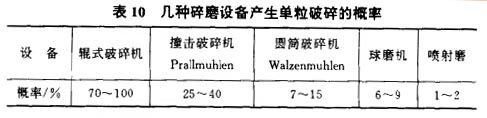 (1)碎矿机中的破碎是一种约束破碎,较粗的矿块被夹持在破碎腔内破碎,破碎力能有效地施于矿石上面,矿块破碎的效率 高。磨矿机中的破碎则不相同,它处理的物料粒度细,不可能实 施约束破碎,而是靠介质落下的冲击和研磨作用,冲击带有随机 特征,研磨的约束作用弱,故破碎的概率低。有人对几种碎磨设 备产生单粒破碎的概率排列如表10。表10说明,球磨机破碎概率 是非常低的。破碎的概率越低,破碎过程的能量损失越大从磨矿机破晬力的特性和破碎概率低的特点出发可以得出结 论:应该在保证破碎力足够的前提下尽量增加球数,从而提高打 击次数和增大研磨面积。