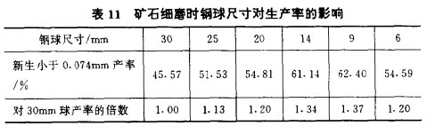 (2)磨碎作用是通过介质实现的,介质尺寸选择恰当与否对 磨碎过程影响很大。介质尺寸过大,打击次数过少,过大的破碎 力又往往发生贯穿破碎,同时研磨面积小,研磨能力弱。介质尺 寸过小,破碎能量不足,一次实现不了破碎时矿粒接受的变形能 又作弹性恢复而使能量损失。矿粒经多次破碎力作用而达到疲劳极限时也能破碎,但破碎概率低。当球径和矿石粒度相适宜时,破 碎力作用精确,破碎作用往往从结合力弱的晶介面上破裂,既节省能耗又增加矿物解离的选择性。表11举出矿石细磨(处理物料粒度0. 3mm)下介质尺寸对小于一0. 074mm产率的影响,说明过大过小的球径细磨效率均低,尺寸恰当时效率才最高。
