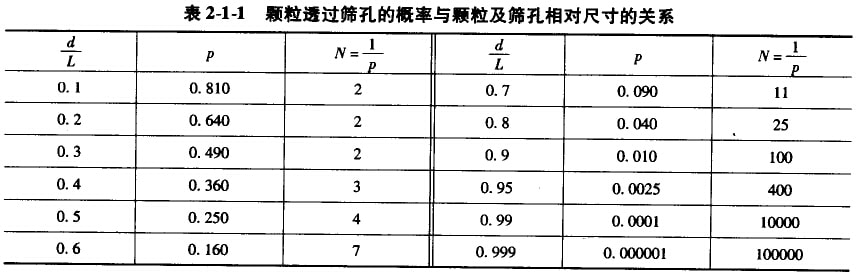 这里所讨论的贝值就是颗粒透过筛孔的概率为p时必须与颗粒相遇的筛孔数目。由此可见,筛孔数目越多,颗粒透过筛孔的概率越小,当N值无限增大时,P愈接近于零。