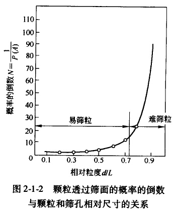取不同的今比值计算出的P和N值,见表2—1—1。利用这些数据可画出图2—14的曲线。曲线可大体划分为两段,在颗粒直径d小于0.75L的范围内,曲线较平缓,随着颓粒直径的增大,颗粒透过筛面所需的筛孔数目有所增加。当颗粒直径超过0.75L以后,曲线较陡,颗粒直径稍有增加,颗粒透过筛面所需的筛孔数目就需要很多。因此,用概率理论可以证明,在筛分实践中,把d<0.75L的颗粒称为“易筛粒”和d>0.75L的颗粒称为“难筛粒”是有道理的。