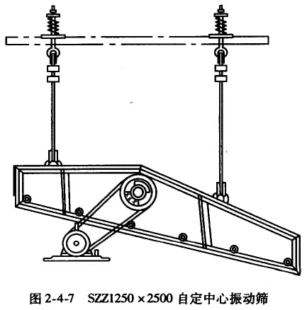 图2-4-7所示为国产阳SZZ1250×2500自定中心振动筛的外形图。主要由筛箱、振动器、弹簧等部分组成。筛箱用钢板和钢管焊接而成,筛网用角钢压板压紧在筛箱上。在振动器的主轴上,除中间部分制出偏心外在轴的两端并装有可调节配重的皮带轮和飞轮。电动机通过三角皮带带动振动器,振动器的偏心效应与惯性振动筛的情况相同,使整个筛子产生振动。弹簧是支持筛箱用的,同时也减轻丁筛子在运转时传给基础的动力。