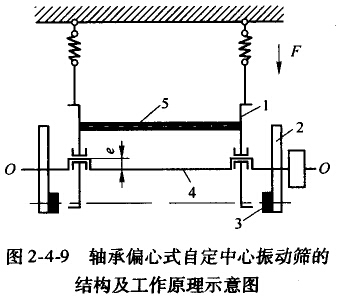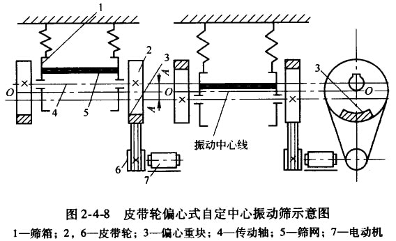 此外,还有一种轴承伯心式自定中心振动筛,图2-4-9是它的示意图。图中表明,由于轴承与轴的中心线偏离距离A(约等于振幅),在振动中偏心铀颈虽有向上或向下的位移,但皮带轮相接文的位置却是不变的。