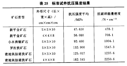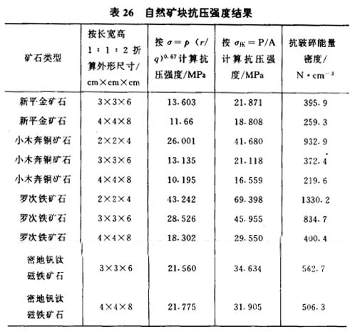 考察岩矿抗压强度的整个测定过程,可以断定所测定的标准试件抗压强度比磨矿过程中自然矿块的抗压强度显著偏大,表25 及表26的结果即是证明。表25及表26的对比结果说明,与标准试件重量或折算外形尺寸基本相同的自然矿块的抗压强度仅为标准试件的20%~30%。其原因在于,首先,在试样挑选过程中,强度低的岩矿一般不被选择;其次在制备标准试件的过程中,一些强度低的试样也因锯磨加丄等原因破裂;更重要的是标准试件的受压面要磨平,以防止在测定过程中出现应力集中现象,而自然矿块的破碎则是高度应力集中。显然,自然矿块的抗压强度更有代表性及实用性,因为磨矿过程中钢球与矿石之间为点接触,破碎过程中的应力集中现象很普遍。