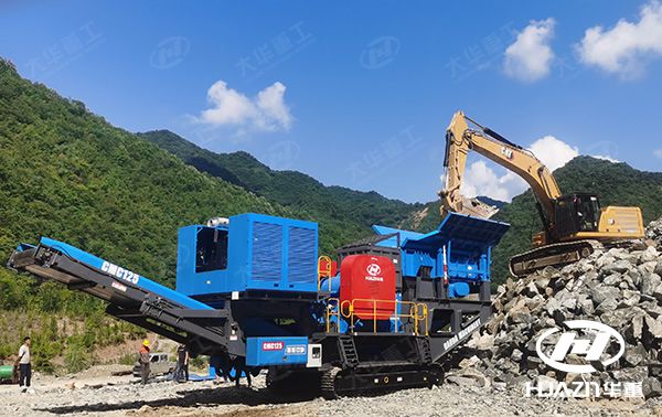 南阳时产450吨橄榄石破碎生产线现场,大型履带式移动破碎站目前正在生产现场高效平稳运行中