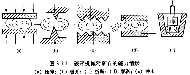 以上几种破碎施力方式是破碎机械中常见的方式,但并不是每种破碎机中都包含这些方式,由于破碎机械的运动方式决定了每种破碎机中往往以一种破碎方式为主而辅以其他破碎方式,如颚式破碎机中以压碎力为主,同时兼有折断力作用,而球磨机中以冲击及磨剥作用为主等。但这里也应指出,破碎机械都是用它的工作部件以动载荷反复作用于矿石,因而均具有一定的冲击效果。