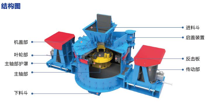 4、为了保证设备的整体性能,PLK系列立轴冲击破碎机对关键部件例如叶轮、轴承筒、主机体等进行结构优化设计,确保该破碎设备在破碎作业时高产、高效、低成本。