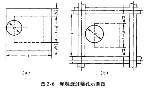 上式说明,筛孔尺寸愈大,筛丝和颗粒直径愈小,则颗粒透过筛孔的可能性愈大。还可以看出,筛孔面积与筛面面积之比l2/(l + a)2愈大,则透筛概率愈高。