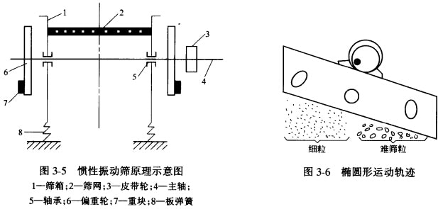 惯性振动筛由于振幅小而振次髙,适用于中、细粒物料的筛分,并且要求在给料均匀的条件下工作。因为振幅随给矿量的变化而改变,当给矿童加大时,筛子的振幅减小,易发生筛孔堵塞现象;反之,当给矿量过小时,筛子的振幅加大,物料颗粒会很快地跳跃而越过筛面,这两种情况都会导致筛分效率降低。由于筛分粗粒物料时需要较大的振幅,才能使物料松散,而且筛分粗粒时,又很难保证给料均勻,故惯性振动筛只适用于中、细粒物料,它的给料粒度一般不能超过100 mm。同时,筛子不宜制造得太大,只有中、小型选厂才宜采用。
