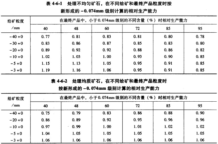 磨矿产品粒度对于生产能力的影响,决定于两个相互矛盾的因素。一方面,磨租粒原矿至规定细度时,随磨矿时间的增长,被磨物料 的平均粒度皆愈来愈小,磨矿机的生产能力因而愈到后期愈高。另一方面,由于磨矿的选择作用,易磨部分已被磨细.剩下的都是难磨 部分,因而磨矿机的生产能力愈到后期愈低。由于这两种情况相反的因素影响,磨矿产物粒度与磨机处理能力的关系,可能是上升的、 下降的或先上升后下降,以及实际上没有变化等情况,随这两个矛盾因素的对比所决定。大体上说,对于均质矿石,磨矿机的相对生产 能力随磨矿细度的增加而增加,表示这两种情况的数据载于表4-6-1和表4-6-2。