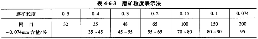 磨矿产品的粒度,通常是用磨至大于某筛级的筛上层百分数或用-0.074mm的含量表示,表4-6-3是浮选厂对于磨矿粒度的表示法,可作为参考。
