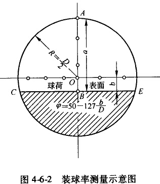 图4-6-2为磨机横截面,影线部分表示磨机静止时球荷所占的面积,D为磨机内直径,测定球荷表面CBE到磨机筒体的最高顶点A的距离 为a,则球荷表面到磨机中心的距离b由图看出为: