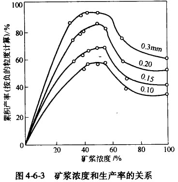 图4-6-3说明矿浆浓度与磨矿效果的关系,由图中看到,只有磨矿浓度适当时,产出率才会员高,它随被磨物料性质及工艺条件而定。就中等转速的磨机来说,租磨矿(产品细度在0.15-以上)或磨比重大的矿石时,磨矿浓度应当较大,约75%-82%(固)。细磨矿(产品细度在 0.01-0.075mm)或磨比重较小的矿石时,磨矿浓度应低些,通常为65%-75%(固)。转速较高时,磨矿浓度应稍低一点。某厂的棒磨机的 磨矿浓度以78%-80%(固)为最好,这时产出的+0.25mm的较少,-0.074mm较多。另一个矿的球磨机,第一段磨的磨矿浓度以72%-75%( 固)较好,第二段以69%-72%(固)较好。这是矿石性质不同的结果,影响的矿石性质主要是矿石比重及含泥量因素。