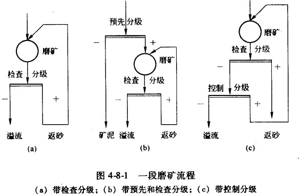 采用一段磨矿流程时,磨矿机开路工作容易产生过粉碎现象。通常,磨矿机都是与分级机构成闭路循环,常用流程有以下三种,如图4-8-1所示。