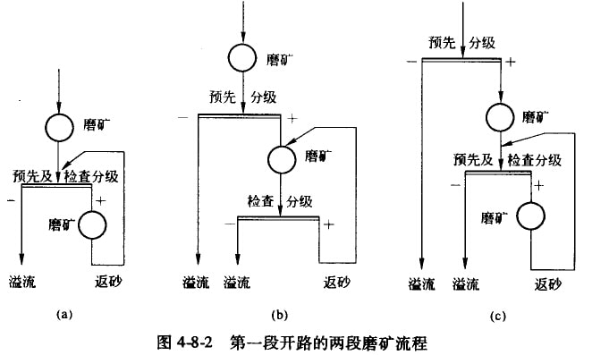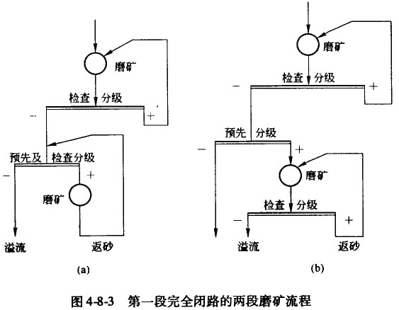 图4-8-3中流程(a)和(b)的区别仅在于第二段的分组,前者的预先分级和检查分级是合并的,后者是分开的。采用流程(b)时,原生矿泥和矿石中的易碎部分不再进入第二段的检查分级机,对于产生次生矿泥的矿石,第二段分级机的工作可能不稳定,因而会降低分级效率。采用流程(a)时,当破碎车间的最终产物粒度减小时,磨矿机的生产能力会有所增加,这时分级机可能成为磨矿车间的薄弱环节。在这种情况下,可以改用流程(b),或安装补充的中间分级机。