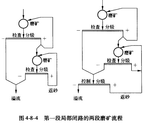 局部闭路流程的缺点是:返砂从第一段运输到第二段,需要用坡度大的溜槽或采用运输机械;第二段磨矿的检查分级,在处理产生少量的次生矿泥的矿石时,会引起分级机工作的困难。