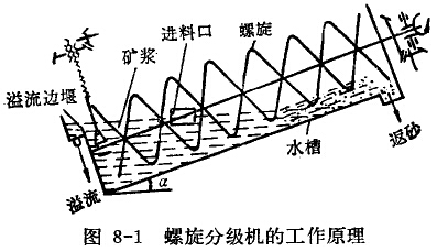 螺旋分级机(图8-1)通常是由以下几部分组戊:半圆形的水槽;作为排矿机构的螺旋装置;支承螺旋轴的上、下轴承部;螺旋轴的传动装置和螺旋轴的升降机构。