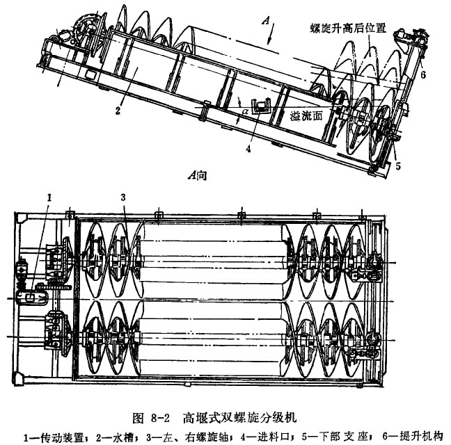 图8-2为高堰式双螺旋分级机的结构图。半圆形水槽2通常用钢板和型钢焊成,其侧壁没有进料口。返砂口介槽体上端的下部。为了在必要时能排出砂浆,水槽下部没有放水阀,正常工作时关闭。