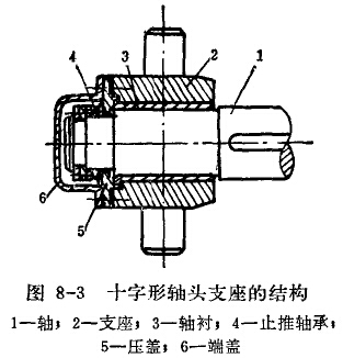 十字形轴头支座的结构如图8-3所示。支座两侧的轴头支承在传动架上。这种装置可以满足螺旋轴在作旋转运动的同时,又可作升降运动。